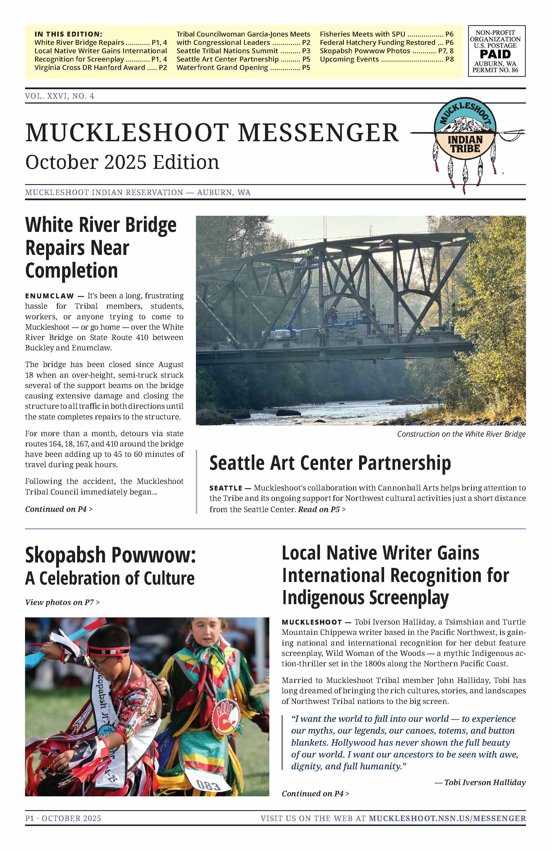 The Muckleshoot Messenger is a Tribal publication created by the Muckleshoot Office of Media Services. Tribal community members and Tribal employees are welcome to submit items to the newspaper such as news, calendar items, photos, poems, and artwork.